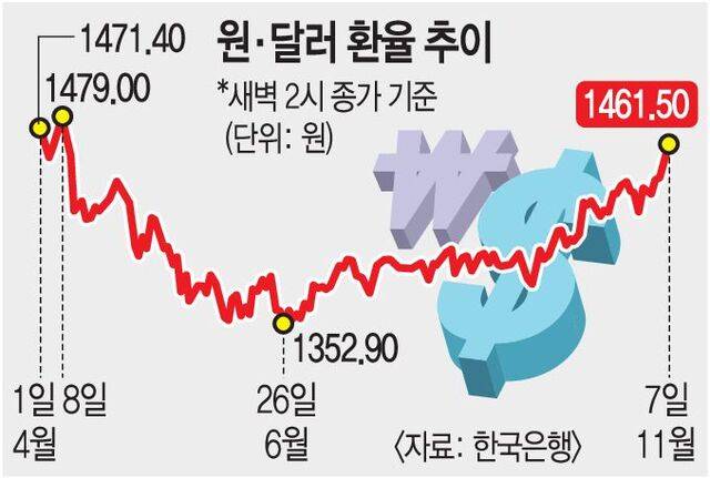 9일 한국은행에 따르면 지난 7일 서울 외환시장에서 달러 대비 원화 가격은 새벽 2시 종가 기준 1461.50원에 거래를 마치며 지난 4월 9일(1472.00원) 이후 7개월 만에 최고치를 기록했다. 환율은 지난 3일 1431.30원으로 거래를 시작한 뒤 5거래일 내내 올라 2.12% 급등했다. 주요국 통화 가운데 절하율 1위다. 같은 기간 달러 대비 유로화는 0.38%, 스위스프랑은 0.38%, 캐나다달러는 0.06% 절상됐고 엔화는 0.53%, 영국 파운드화 0.14%, 스웨덴 크로나는 0.46% 절하됐다.