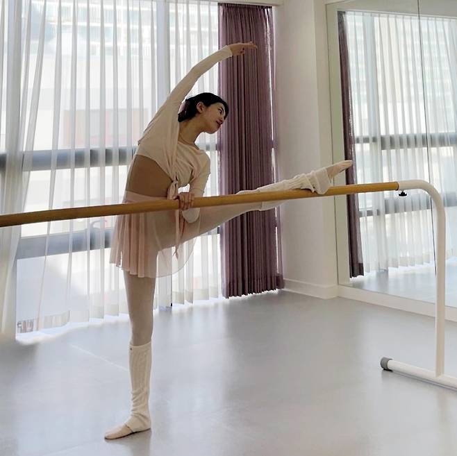 사진 속 수지는 옅은 핑크색과 그레이 톤의 발레복을 완벽하게 소화하며 수준급의 발레 실력과 유연성을 뽐냈다.
