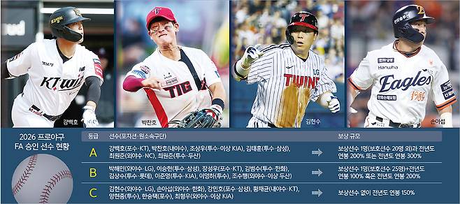 강백호(KT), 박찬호, 조상우(이상 KIA), 투수 김태훈(삼성), 외야수 최원준(NC), 투수 최원준(두산·이상 원소속팀)은 A등급으로, 이 선수들을 영입한 팀은 보상선수 1명(보호선수 20명 외)과 전년도 연봉 200% 또는 전년도 연봉 300%를 원소속팀에 지급해야 한다. 박해민(LG), 우완 투수 이승현(삼성), 장성우(KT), 김범수(한화), 김상수(롯데), 이준영(KIA), 이영하, 조수행(이상 두산)은 B등급, 김현수(LG), 손아섭(한화), 강민호(삼성), 황재균(KT), 양현종, 한승택, 최형우(이상 KIA)는 C등급이다. B등급 보상 규모는 보상선수 1명(보호선수 25명)+전년도 연봉 100% 혹은 전년도 연봉 200%, C등급은 보상선수 없이 전년도 연봉 150%다. 각 구단은 3명의 외부 FA까지 영입할 수 있다.