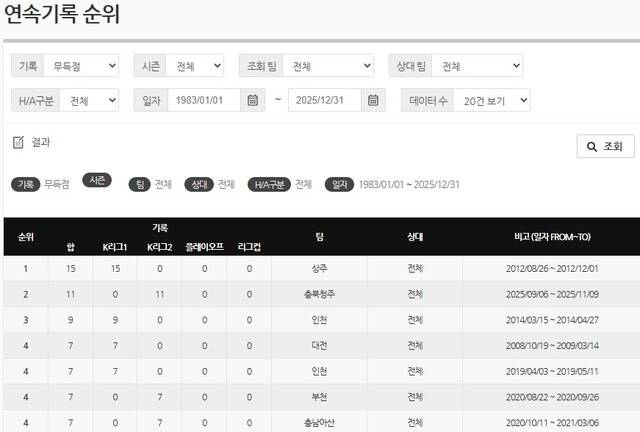 즉, 실질적인 경기 결과로 만들어진 연속 무득점 기록만 놓고 보면 충북 청주가 K리그 역사상 최장 기록을 세운 셈이다.