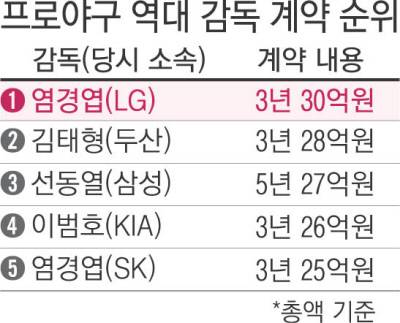 역대 계약 상위권에 있는 감독들 모두 구단에 역사적인 우승을 안겼거나 장기간 팀을 최상위권으로 이끌어 구단의 전폭적인 신뢰를 받은 인물들이었다. 28년 동안 우승하지 못하던 LG를 3년 동안 두 번이나 우승시킨 염 감독은 최초의 30억원대 계약으로 역대 최고 기록을 썼다.
