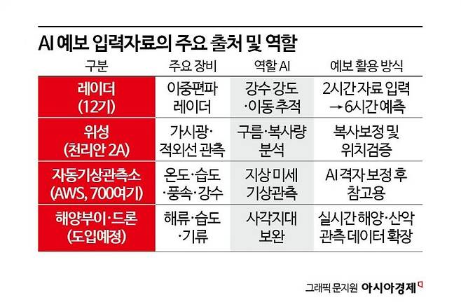 기상청은 최근 인공지능(AI) 기반 예보체계를 본격적으로 가동하고 있다. 초단기 강수예측모델 '나우알파(NowAlpha)'는 전국 10개 기상레이더에서 2시간 동안 관측한 강수 자료를 입력받아 6시간 뒤까지의 강수 강도를 10분 간격으로 예측한다. 계산에 걸리는 시간은 40초 이내로, 기존 수치예보 모델보다 10배 이상 빠르다.
