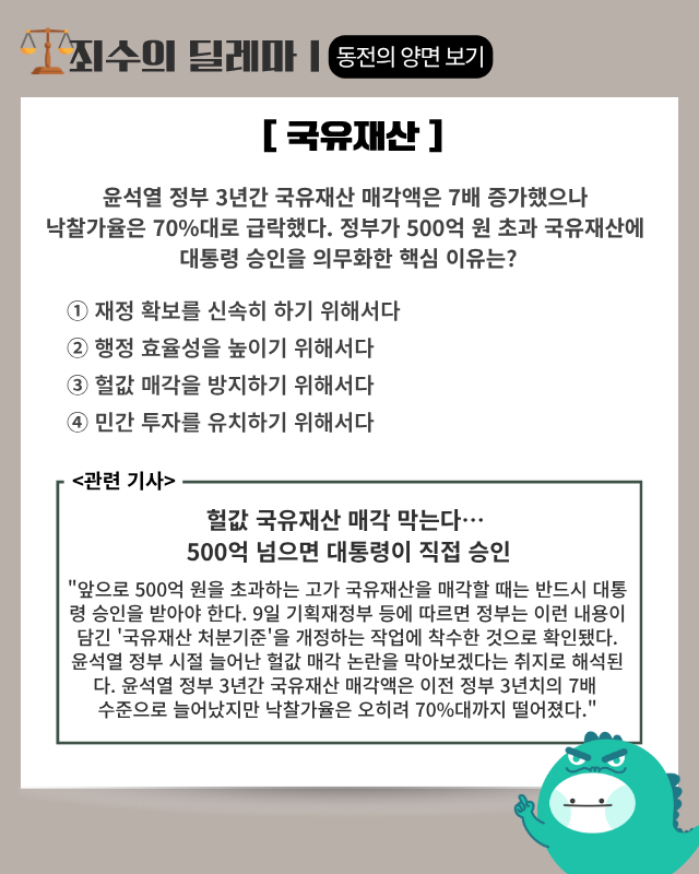 ▶ 기사 바로가기: 헐값 국유재산 매각 막는다···500억 넘으면 대통령이 직접 승인