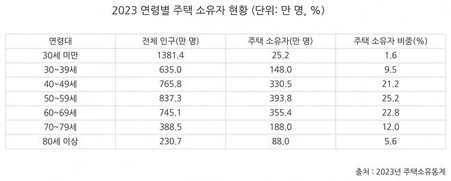 또 다른 통계를 뜯어보면, 40대 내부에도 자산이 축적된 집단이 따로 있음을 알 수 있다. 통계청이 발표한 '2023년 주택소유통계' 결과에 따르면, 40대 주택 소유자 비중은 21.2%, 50대 주택 소유자 비중은 25.2%다. 특히 2건 이상의 주택을 소유한 비중은 40대 14.8%, 50대 17.9%를 차지해 전체 연령대 중 가장 높았다.