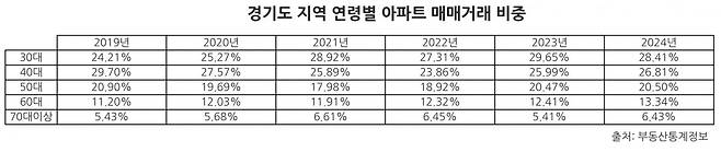 경기도와 인천에서도 30대의 아파트 매입 비중은 꾸준히 높아지고 있다. 경기도의 경우 30대 매입 비중은 2019년 24%에서 2024년 28%까지 올랐고, 인천에서도 같은 기간 24%에서 28%로 증가했다. 집 상승기를 거치며 서울 진입에 실패한 30대가 매입 시점을 늦추기보다는 '지금 살 수 있는 집'에 집중한 결과로 보인다.