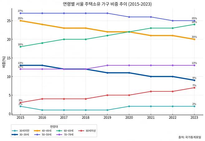 통계가 제공되는 2015년에서 2023년을 분석한 결과, 2015년 25%였던 40대의 서울 주택소유 가구 수는 2023년엔 20%로 하락했다. 넓은 의미에서 영포티로 엮이는 50대는 27%에서 25%로 소폭 줄었다. 30대 역시 13%에서 9%로 비중이 줄었다. 반면, 60대 이상 연령대에서는 서울 주택을 더욱 많이 소유하게 됐다. 2015년에 18%이던 주택 소유 가구 비중은 2023년에는 24%까지 증가했다.