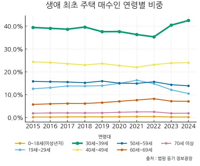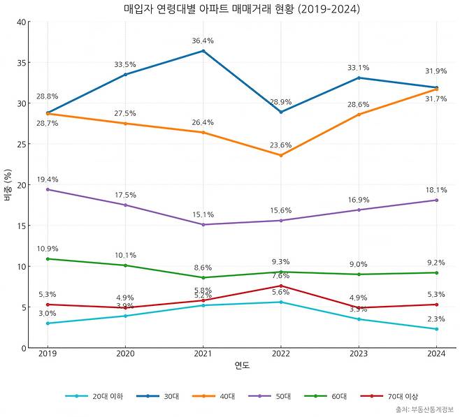 특히 최근 들어 30대 주택 구입자는 부동산 시장의 주축으로 자리 잡았다. 2024년 연령별 아파트 매매 거래 현황을 보면, 30대 비중은 31.7%까지 상승해, 31.9%를 기록한 40대와 어깨를 나란히 했다.
