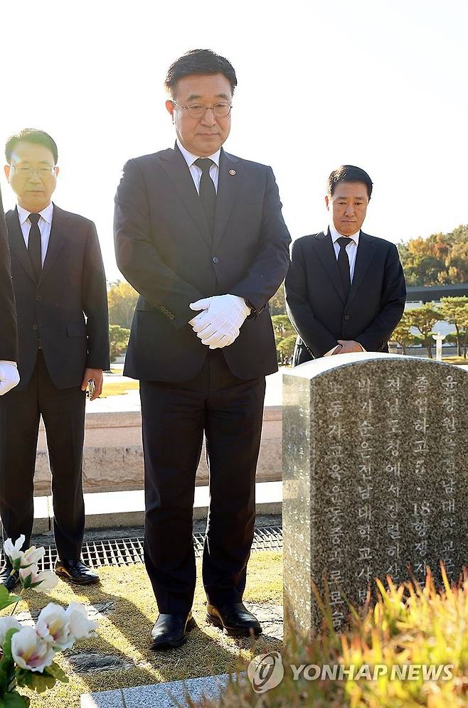 (광주=연합뉴스) 조남수 기자 = 행정안전부 윤호중 장관이 10일 오전 광주 북구 국립5·18민주묘지를 찾아 윤상원 열사 묘에 참배하고 있다. 2025.11.10
