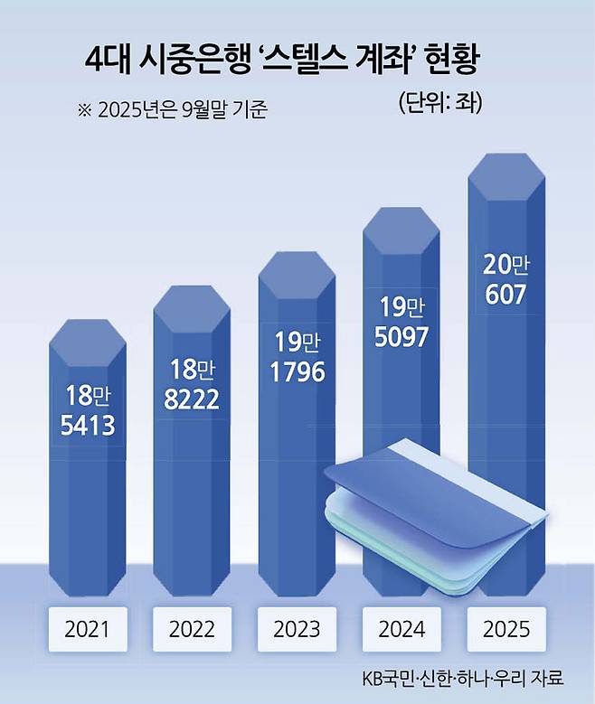 10일 4대 시중은행(KB국민·신한·하나·우리)을 대상으로 최근 5년간 스텔스 통장 현황을 집계한 결과, 지난 9월 말 기준 등록 건수는 20만개(20만607개)를 돌파한 것으로 나타났다. 2021년 18만5413개에서 ▷2022년 18만8222개 ▷2023년 19만1796개 ▷2024년 19만5097개로 꾸준히 증가했다. 매년 3200여건씩 증가하더니 올해 들어서만 5500건 넘게 신규 개설됐다.