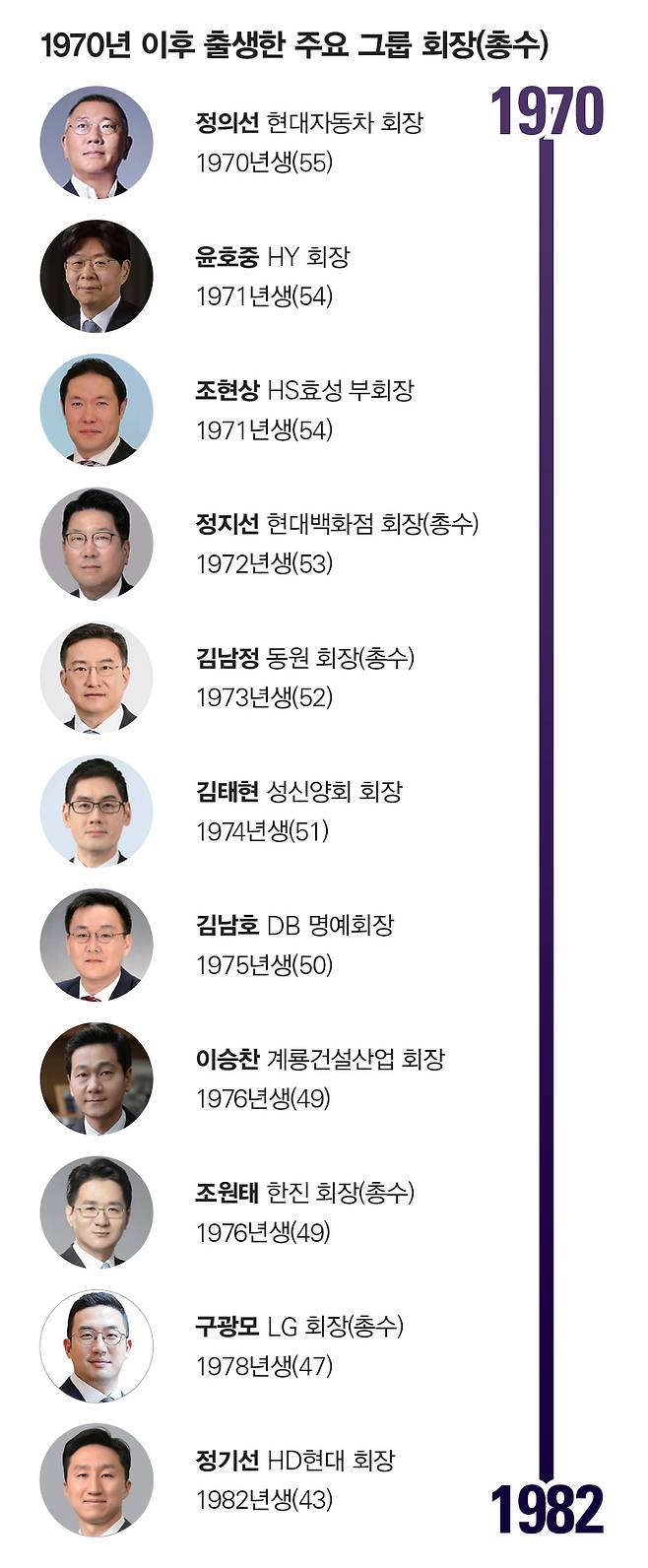 범위를 10대 그룹 밖으로 확대해도 상황은 다르지 않다. 지난해 7월 형제 경영을 마치고 효성그룹과 분리한 조현상 HS효성 부회장과 윤호중 HY(옛 한국야쿠르트) 회장, 정지선 현대백화점 회장, 조현범 한국앤컴퍼니 회장, 최윤범 고려아연 회장, 김남정 동원그룹 회장, 이승찬 계룡건설산업 회장, 최성원 동양고속 회장, 김남호 DB그룹 명예회장 등이 모두 1970년대생이다. 재계 막내로 한때 비공식 행사의 사진 촬영을 자처했던 최태원 SK그룹 회장(1960년생)이 현재는 재계의 '맏형'이 됐을 정도다. 박주근 리더스인덱스 대표는 "오너 2세 시절만 해도 그룹 경영권은 부모의 유고 때 물려받는 경우가 대부분이었다"면서 "요즘은 일찌감치 자녀를 경영에 참여시키고, 여건이 됐다 싶으면 속도감 있게 넘기는 게 트렌드"라고 설명했다.