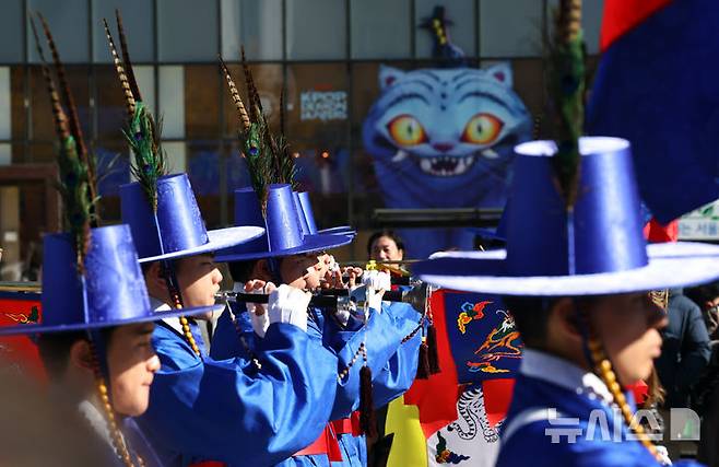 [서울=뉴시스] 최진석 기자 = 해군 국악대가 10일 서울 종로구 광화문광장에서 열린 해군 창설 80주년 네이비 위크 in 서울행사에서 공연을 하고 있다. 2025.11.10. myjs@newsis.com