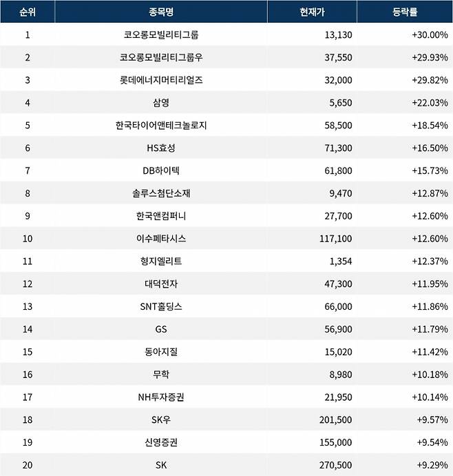 이어 상승률 2위 코오롱모빌리티그룹우(45014K)는 주가가 +29.93% 폭등하며 종가 37,550원에 상승 마감했다. 상승률 3위 롯데에너지머티리얼즈(020150)의 주가는 32,000원으로 +29.82% 폭등하며 높은 상승세를 보였다. 상승률 4위 삼영(003720)은 +22.03% 상승하며 5,650원에 마감했다. 상승률 5위 한국타이어앤테크놀로지(161390)는 +18.54%의 급등세를 타고 종가 58,500원에 마감했다.