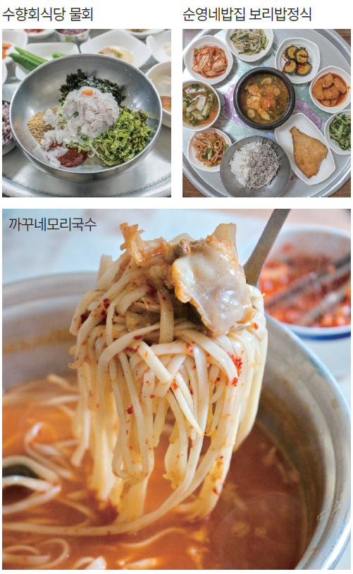 포항은 물회가 유명하다. 국물이 없고 양념은 고추장으로 한다. 수향회식당은 우럭만을 사용해 물회를 낸다. 포항은 의외로 곰탕이 유명한데 평남식당은 뜨끈한 소머리국밥을 토렴해 준다. 옆의 장기식당도 유명하다. 순영네밥집은 보리밥정식으로 널리 알려져 있다. 구룡포에는 아주 오래된 국수공장이 있다. 1971년 문을 연 제일국수공장이다. 원래 구룡포에는 제일국수공장이 생길 무렵 일곱 개의 국수공장이 있었는데, 지금은 모두 문을 닫고 이 집 하나만 남았다고 한다. 지금도 소금물로 반죽하고 재래식 기계를 이용해 면을 뽑아 바닷바람 부는 건조장에 내다 말린다.