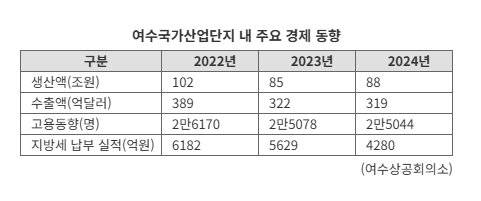 여수상공회의소에 따르면, 지난해 여수산단의 생산액은 87조8400억원으로 지난 2022년 대비 13조8700억원 줄었다. 같은 기간 수출액은 389억달러에서 319억달러로 크게 감소했다.