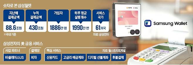 삼성전자가 미국에서 영국계 금융회사 바클레이스와 손잡고 신용카드를 출시할 것이란 소식이 전해지자 삼성의 금융 플랫폼 확장 전략에 관심이 쏠리고 있다. 반면 삼성월렛 활성화 고객이 많은 국내에서는 금산분리 등 각종 규제 때문에 삼성전자와 금융회사 간 제한적 협업만 이뤄진다는 지적이 나온다.