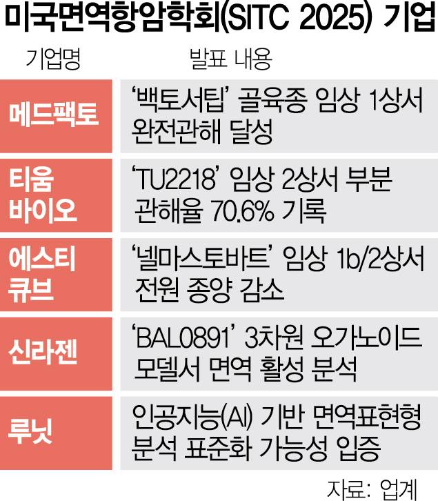 국내 제약·바이오 기업들이 ‘미국면역항암학회(SITC) 2025’에 참가해 항암 관련 연구 성과를 대거 발표했다. 특히 메드팩토(235980)는 ‘백토서팁’ 골육종 임상에서 완전관해(CR)를 달성해 ‘최신초록(LBA·Late Breaking Abstract)’으로 선정되기도 했다.
