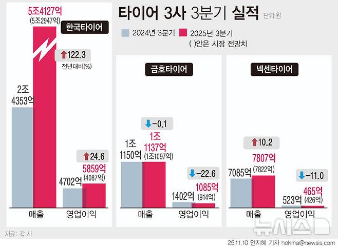 [서울=뉴시스] 한국타이어앤테크놀로지(한국타이어), 금호타이어, 넥센타이어 등 국내 타이어 업체 모두 올해 3분기 영업이익이 증권가 전망치를 웃돌았다. 증권가는 한국타이어의 영업이익이 전년 대비 13.1% 감소할 것으로 봤지만 실제로는 분기 기준 역대 최고 실적을 달성했다. 업계에서는 고수익 제품 라인업 확대와 지역별 생산 거점 다변화가 4분기 실적에도 긍정적으로 작용할 것으로 보고 있다. (그래픽=안지혜 기자)