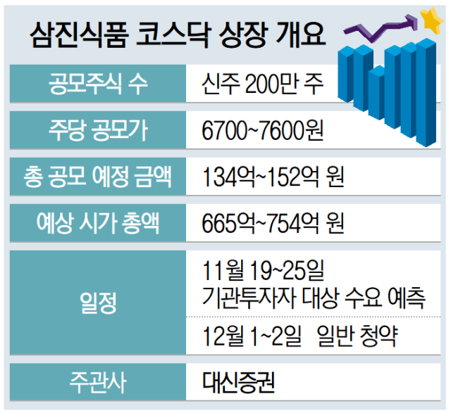 부산어묵을 넘어선 ‘세계어묵’으로의 도약을 꿈꾸는 삼진식품은 지난 3일 금융위원회에 코스닥 상장을 위한 증권신고서를 제출했다. 한국거래소 코스닥시장본부는 지난달 30일 삼진식품의 상장예비심사를 승인한 바 있다. 200만 주 신주 공모를 위한 일반 청약은 다음 달 1~2일 이뤄지며, 다음 달 중 코스닥에 상장될 예정이다.