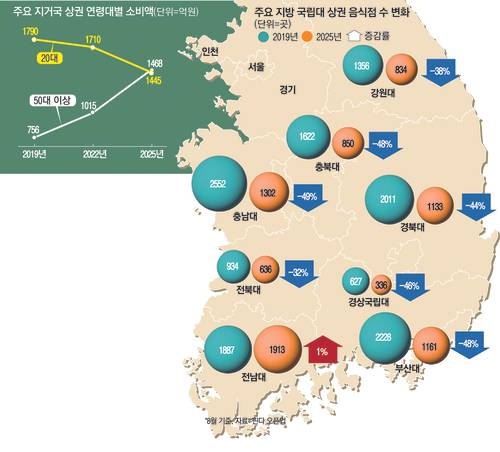 이종우 아주대 경영학과 교수는 “대학교 근처는 대학생들을 겨냥한 가성비 좋은 매장이 많은데, 줄어들거나 떠난 청년들의 자리를 중장년층이 겨우 메우고 있는 상황”이라고 분석했다.
