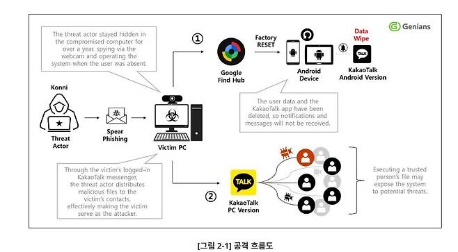 보고서에 따르면 지난 9월 5일 해커가 국내 한 심리 상담사의 스마트폰을 초기화하고 탈취한 카카오톡 계정을 통해 '스트레스 해소 프로그램'으로 위장한 악성 파일을 지인들에게 다수 전송했습니다. 같은 달 15일 한 북한 인권 운동가의 안드로이드 스마트폰도 초기화되고 탈취된 카카오톡 계정을 통해 악성 파일이 지인 36명에게 동시다발적으로 유포되는 사건이 일어났습니다. 카톡 메시지를 통한 악성코드 유포는 신뢰가 있는 지인 관계를 위장한 전형적인 사회공학 기반 북한발 해킹 공격으로 분석됐습니다.