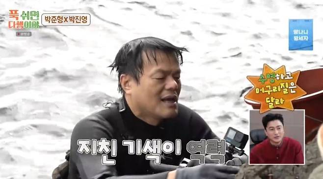 그러나 박준형은 자유형을 하는 박진영을 보며 "누가 수경 쓰고 수영을 저렇게 하냐. 이거 수영대회 아니다"라며 웃으며 레슨을 시작했다. 박준형은 "내가 박진영보다 좀 더 잘할 수 있단 자신감이 있다"라며 지금이 기회라고 생각했다. 그러나 박진영은 "해 봐"라며 시범을 보여달라고 했고, 결국 박준형은 박진영의 뜻대로 움직였다.