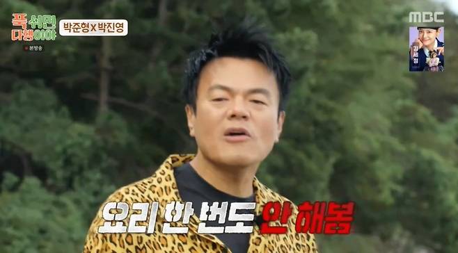 박준형은 "우리 미국에서 같이 살았을 때 했잖아. 그럼 누가 한 거야. 내가 다 한 거야?"라고 놀랐고, 박진영은 "난 할 줄 모른다. 세탁기 작동해 본 적 없다"라며 "요리는 달걀 프라이를 시도해 봤는데 프라이팬을 태웠다. 그다음부터 안 한다"라고 밝혔다.