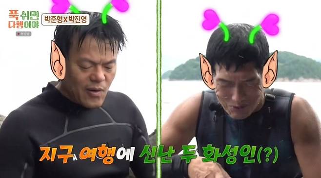 박준형은 박진영이 해산물을 좋아하는 걸 언급하며 "네가 최고로 좋아하는 곳에 온 거다. 너처럼 해산물을 좋아하는 미친X 처음 본다. 우리 미국에 같이 살 때 똑같은 초밥을 3개월 동안 매일 먹더라"라고 혀를 내둘렀다. 박진영은 "해산물을 너무 좋아하고, 내가 따서 먹는 것에 대한 로망이 있다"라고 눈을 반짝이며 기대감을 드러냈다.