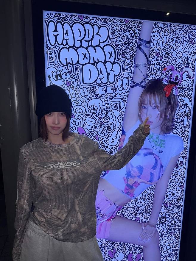 (MHN 이태희 인턴기자) 그룹 트와이스 모모가 팬들의 생일 광고 앞에서 찍은 인증샷으로 훈훈함을 자아냈다.