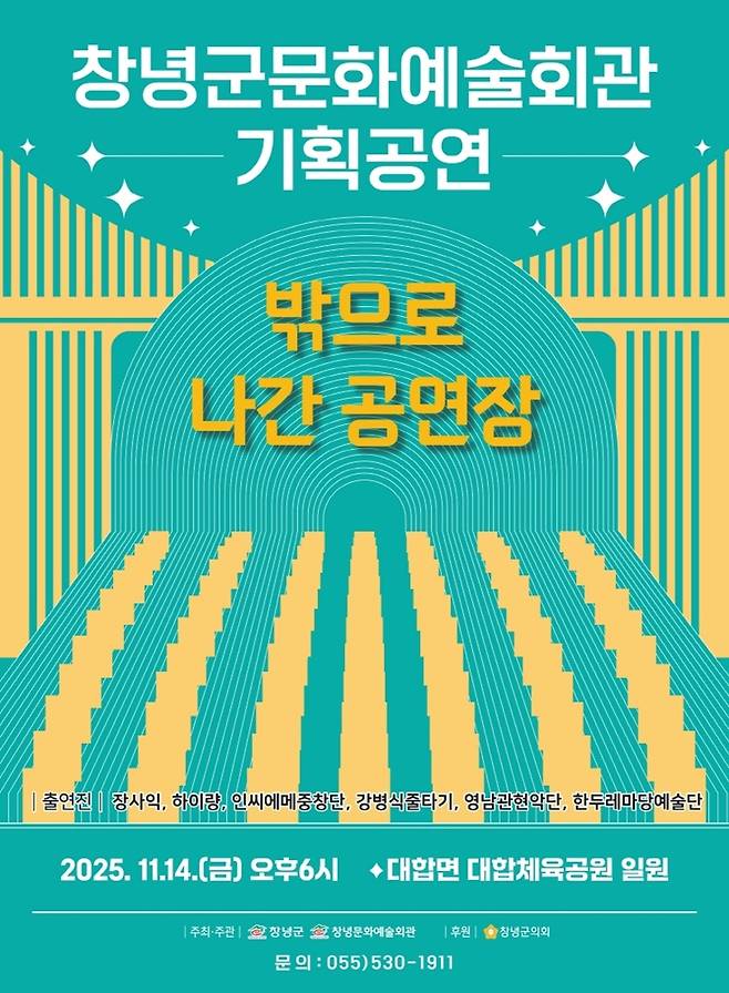 창녕군 대합면 체육공원 일원에서 오는 14일 오후 6시부터 7시 30분까지 특별 기획 공연 ‘밖으로 나간 공연장’ 을 개최한다.