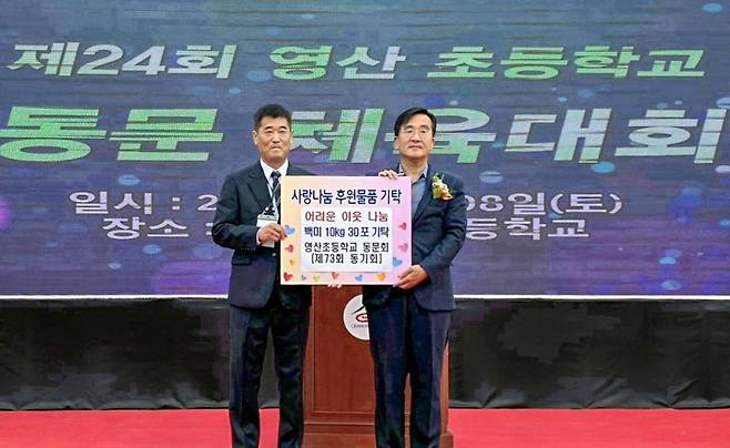영산초등학교 제73회 동기회는 지난 8일 어려운 이웃을 돕기 위해 백미 10kg 30포(약 100만 원 상당)를 영산면사무소에 기탁했다.