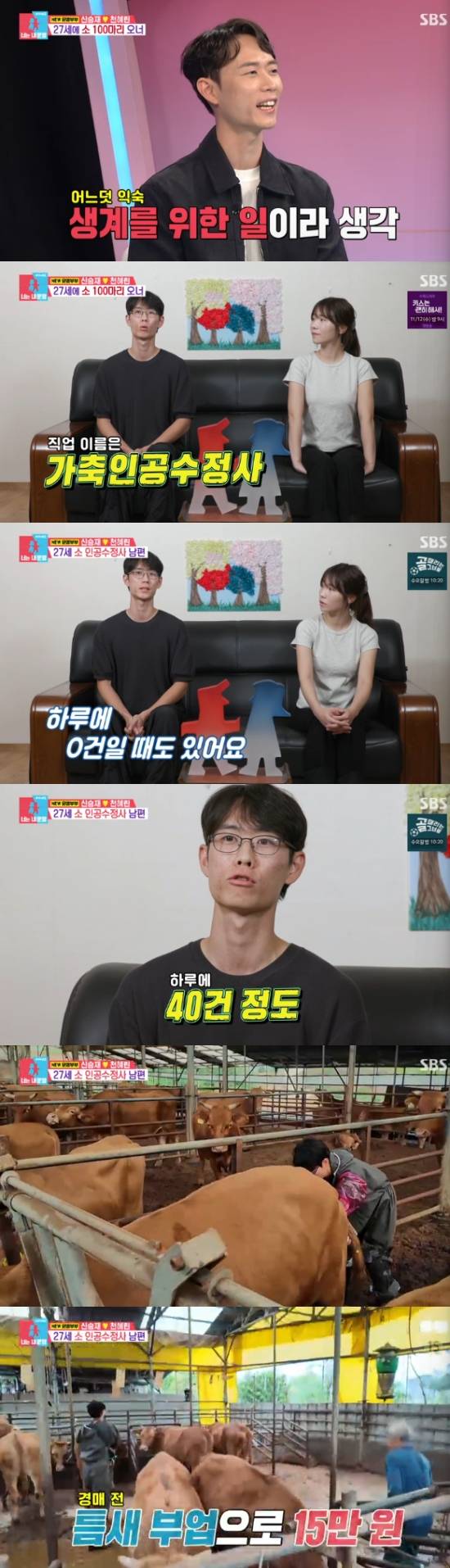 알고보니 소 인공수정 의뢰를 받고 가는 길이었다. 신승재는 "인공수정사 자격증도 있다"면서 부업처럼 일하고 있다고 했다. 인공수정은 한 건당 5만원을 받고, 많이 할 때는 하루에 40건도 했었다고 말해 놀라움을 자아냈다.