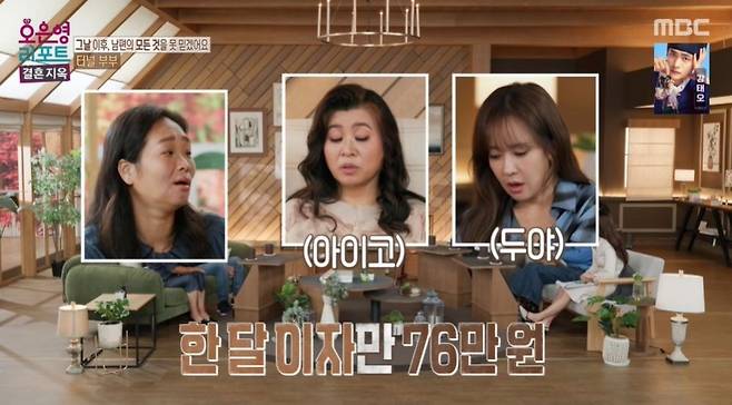 남편은 "갚으라고 불러준 계좌 번호가 사기 계좌였다"라고 했고, 오은영은 "못 갚았는데 4,600만 원 대출은 어떻게 또 받은 거냐"라고 의아해했다. 4,600만 원은 대부업체에서 빌린 거였고, 한 달 이자만 76만 원이었다.