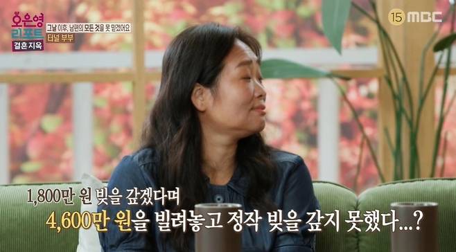 남편은 "갚으라고 불러준 계좌 번호가 사기 계좌였다"라고 했고, 오은영은 "못 갚았는데 4,600만 원 대출은 어떻게 또 받은 거냐"라고 의아해했다.