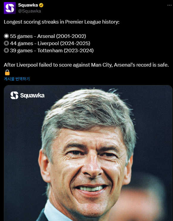 리버풀이 맨시티전에서 득점을 만들지 못하면서 PL 연속 득점 기록이 44경기에서 멈췄다.