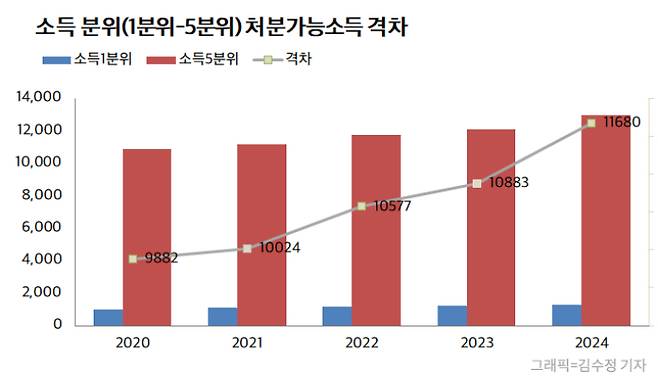 통계에서도 고소득층과 저소득층의 투자 여력 격차가 뚜렷하게 드러난다. 통계청·금융감독원·한국은행의 '2024년 가계금융복지조사' 결과에 따르면, 소득 하위 20% 가구와 상위 20% 가구의 '처분가능소득' 격차는 매년 커지고 있다.