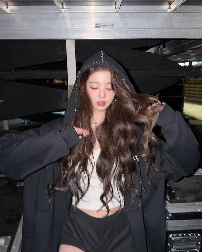 전체적으로 짧은 상하의에 오버핏의 후드티를 걸쳐 큐티하면서도 섹시함은 놓치지 않은 장원영이다.