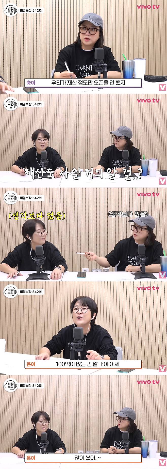 이날 김숙은 "우리는 팬들에게 모든 걸 다 보여줬다. 재산 정도만 오픈 안 했다"고 하자, 송은이는 "재산도 거의 알거다"고 했다.