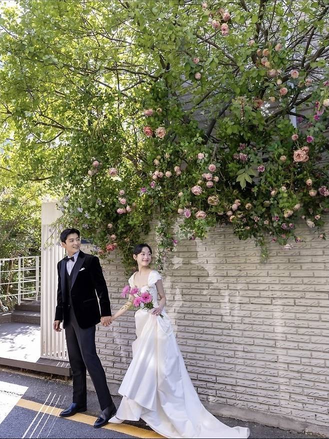 사진 속 그는 부케를 든 채 환하게 웃고 있었고, 턱시도 차림의 배우 장승조와 나란히 서 있었다. 두 사람의 다정한 모습은 마치 실제 결혼식 현장을 방불케 했다.