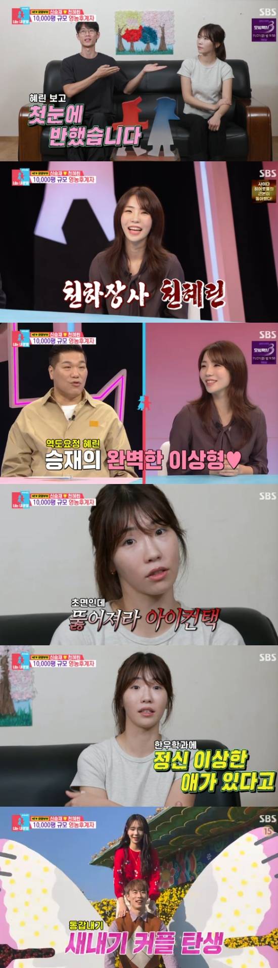 신승재는 "아내를 보고 첫눈에 반했다. 대학교 때 여학우들끼리 무체급 씨름대회를 했었다. 아내가 우승을 했는데, 체급 차이를 무시하고 업어치기를 하는 모습을 보고 반했다. '이 여자다' 싶었다"면서 웃었다.