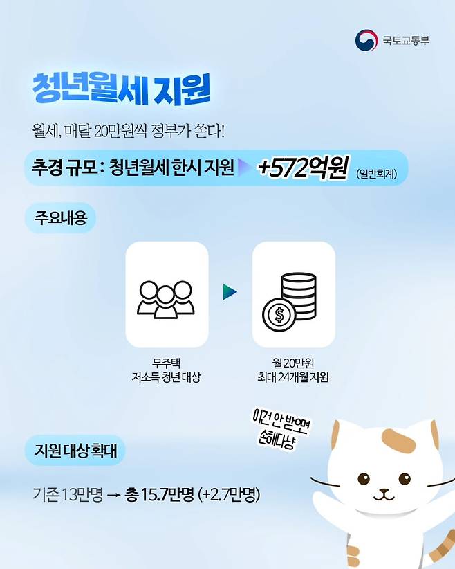 - 추경 규모: 청년월세 한시 지원 +572억 원 (일반회계)