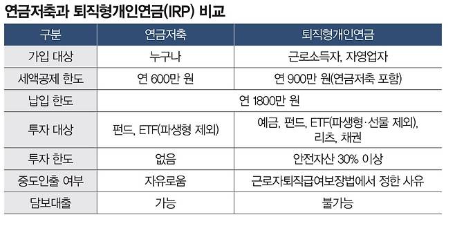 연금저축과 IRP의 차이는 최대 세액공제액이다. 연금저축의 경우 600만 원, IRP는 900만 원(연금저축 포함) 한도다(표 참조). 최대 세액공제 납입 기준인 900만 원에 맞출 경우 환금성이 높은 연금저축 한도 600만 원을 먼저 채우고 나머지 300만 원은 IRP 계좌에 넣는 것이 일반적이다. 연금저축의 경우 해지하지 않고 인출이 가능하지만 IRP는 까다로운 중도 인출 조건을 맞춰야 가능하다. 이는 IRP 계좌가 근로자퇴직급여보장법을 기초로 만들어졌기 때문이다. 추후 퇴직금을 수령하는 용도로도 쓰이기 때문에 보수적인 요건이 적용된다.