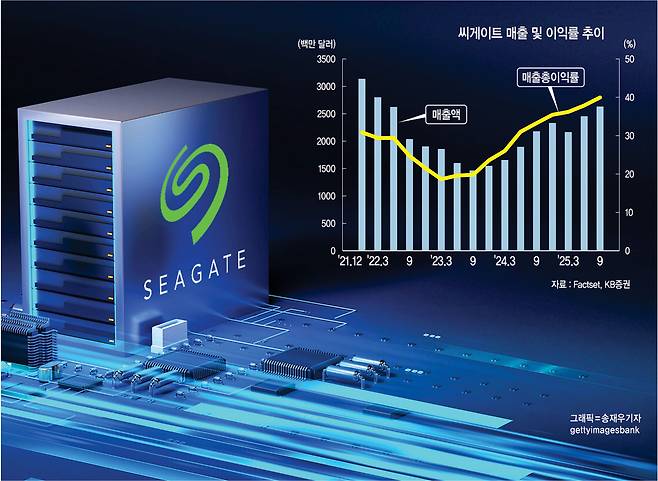 씨게이트 테크놀로지는 1979년 미국 캘리포니아에서 설립된 세계적인 데이터 저장장치 제조사다. 오랜 기간 하드디스크 드라이브(HDD) 시장의 강자로 군림해 왔으며, 특히 엑소스 시리즈를 중심으로 기업 데이터센터 부문에서 매출이 빠르게 증가하고 있다. 씨게이트는 현재 차세대 기술인 열 보조 자기 기록(HAMR)을 기반으로 한 ‘모자이크(Mozaic) 플랫폼’을 통해 초고용량 HDD 시장의 주도권을 확보하고 있으며, 2025회계연도 기준 9개 분기 연속 성장세를 이어가고 있다.