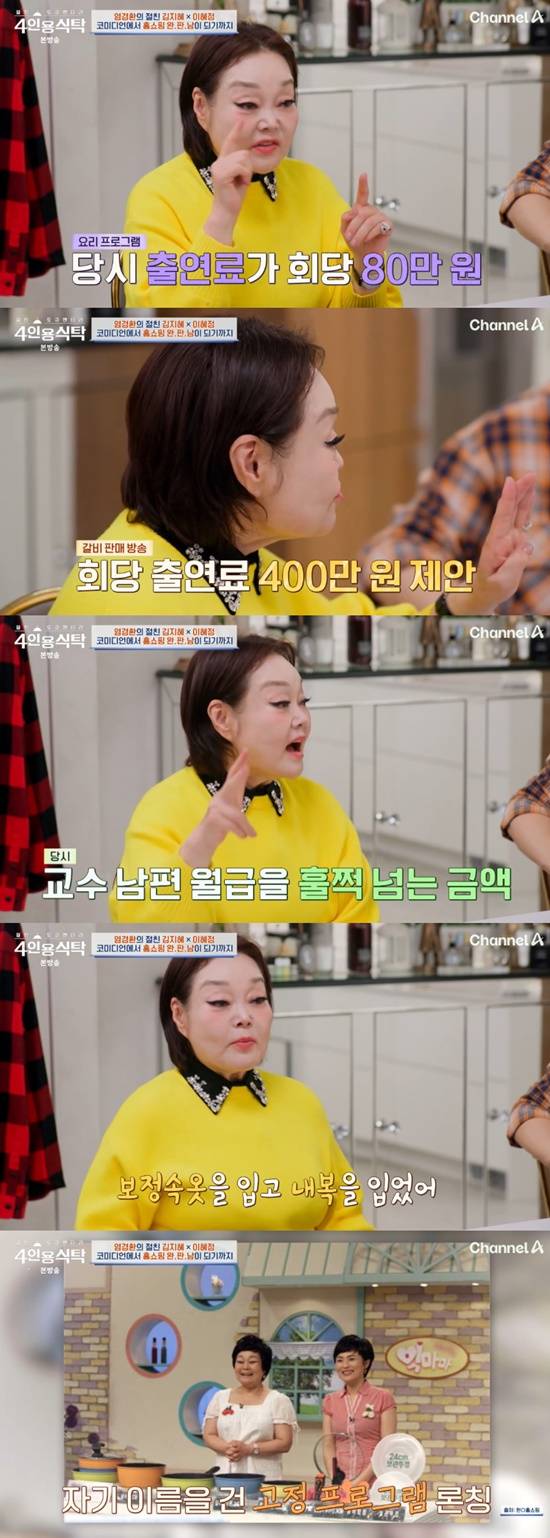 그는 “당시 출연료가 80만 원이었는데 갈비를 팔면 400만 원을 주고 러닝 개런티 2%를 준다고 했다. 교수 남편 월급이 300만 원이었다. 한 번 하면 500만 원을 벌 수 있다는 거다. 첫 방송부터 대박이 났다”고 했다.
