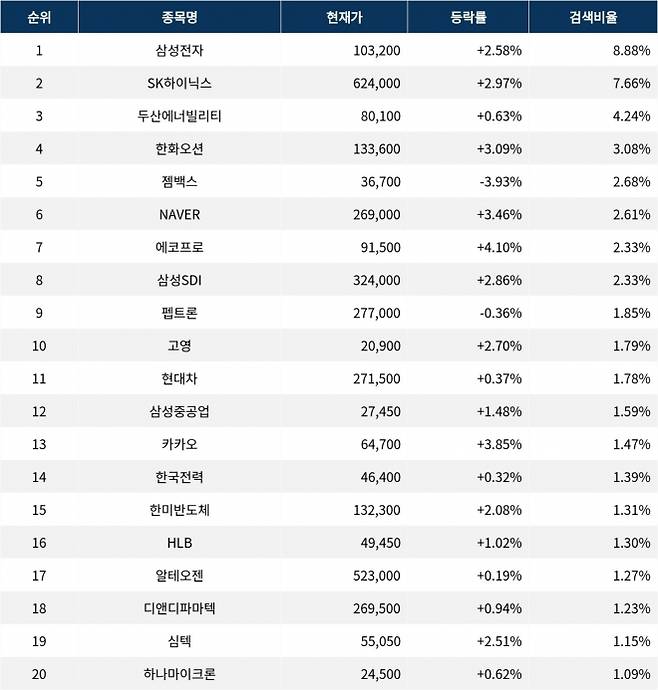 이어 SK하이닉스(000660)가 검색비율 2위를 기록하며 2.97%의 상승세를 보이고 있다. 검색비율 3위의 두산에너빌리티(034020)는 0.63% 상승하며 안정적으로 출발하는 모습이다. 검색비율 4위 한화오션(042660)은 개장 초반부터 3.09% 상승하고 있다. 검색비율 5위 젬백스(082270)는 3.93% 하락하며 약세를 보이고 있다.