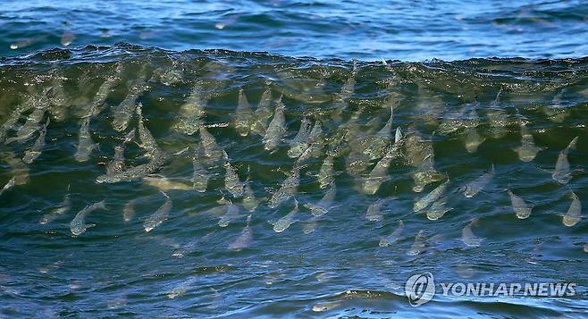 (강릉=연합뉴스) 유형재 기자 = 11일 강원 강릉시 한 해변 앞바다에 엄청 많은 숭어 떼가 나타나 파도를 즐기듯 유영하고 있다. 2025.11.11