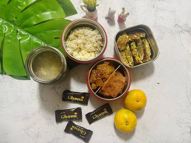 쉬는 시간에 잠깐 에너지를 줄 초콜릿과 비타민음료도 챙기고 말이다. 스팸 대신 옛날 소시지를 넣어도 좋고, 계란말이에 스팸을 다져 넣어도 괜찮겠다. 너무 특별하지 않은, 그래서 더 편안한 구성이다.