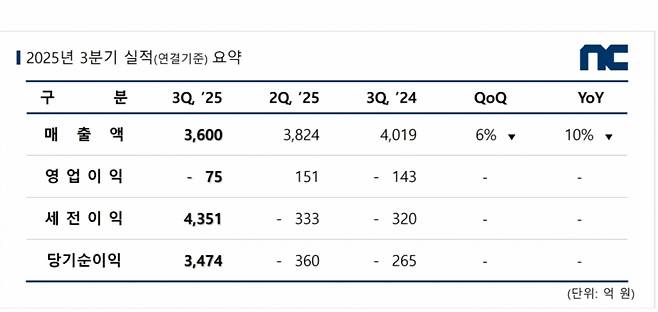 엔씨소프트는 11일 3분기 연결재무제표 기준 매출액 3600억원을 기록해 전년 동기 대비 10% 감소하고 영업적자는 75억원을 기록, 적자가 지속됐다고 밝혔다. 순이익은 3474억원으로 흑자전환했는데, 이는 삼성동 엔씨타워1 매각 대금이 반영된 여파다.