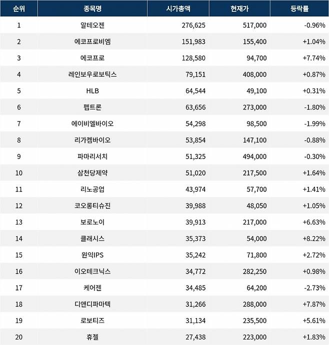 11일 한국거래소에 따르면, 시가총액 1위인 알테오젠(196170)은 현재가 517,000원으로 전 거래일 대비 0.96% 하락했다. 시가총액은 276,625억원이며, 외국인비율은 15.18%다. 거래량은 284,304주로 PER은 293.08배, ROE는 29.52%로 산출된다. 2위인 에코프로비엠(247540)은 현재가 155,400원으로 전 거래일 대비 1.04% 상승했으며, 시가총액은 151,983억원, 외국인비율은 12.79%로 나타난다. 거래량은 407,546주이며, PER은 -196.21배, ROE는 -6.26%로 기록되고 있다.
