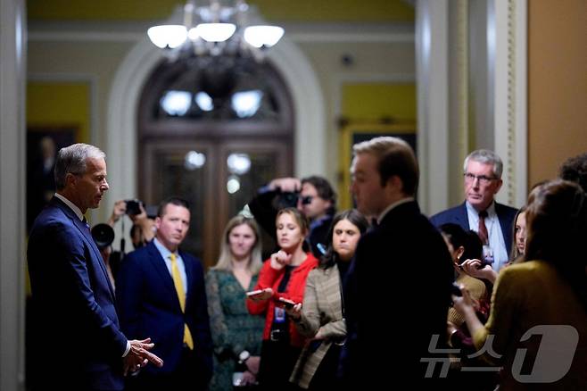 (워싱턴DC AFP=뉴스1) 김경민 기자 = 존 슌 미국 상원 공화당 원내대표가 10일(현지시간) 워싱턴DC 국회의사당에서 상원이 임시 예산안을 통과시킨 후 기자들과 대화하고 있다. 2025.11.10