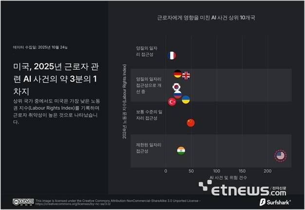 국가별로는 미국이 전체 사건의 약 3분의 1에 해당하는 225건을 차지했으며, 중국이 49건, 한국이 22건으로 뒤를 이었다. 특히 미국은 노동권 지수(Labour Rights Index)가 낮아 근로자들이 AI로 인한 변화에 상대적으로 더 취약한 상황에 놓여 있는 것으로 분석됐다.